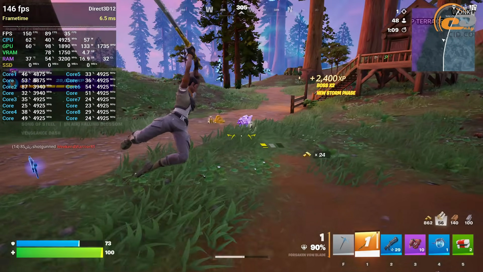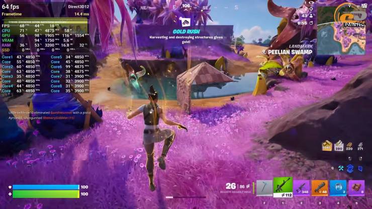 Пограти в найвідоміший батл-рояль Fortnite можна і на високому пресеті графіки, але все ж таки доводиться активувати якісний режим DLSS. Проте, зустрічаються моменти, коли грі не вистачає 6-гігабайтного відеобуферу і вона починає потроху смикатися, що також підтверджує показник дуже рідкісних подій. Тож під час дуже гарячого «файту» можна зустріти і більш неприємні моменти, що призведуть до неминучої поразки.