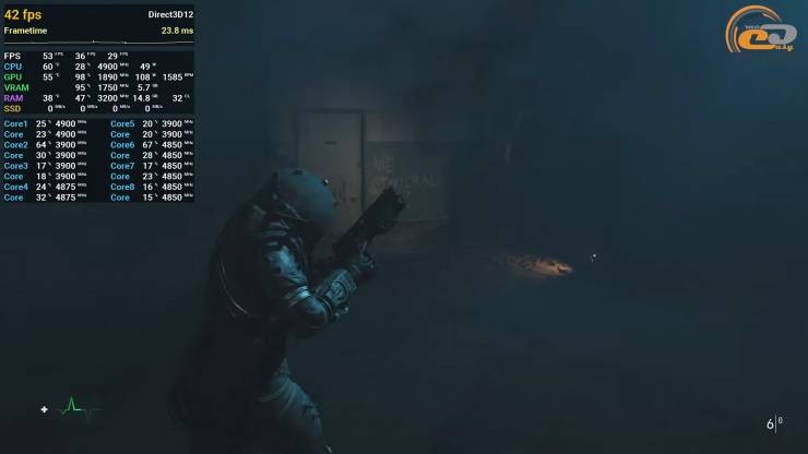 Дуже атмосферний, але ще недостатньо оптимізований горор Cronos: The New Dawn на середньому пресеті графіки разом із збалансованим DLSS виглядає досить гарно, при цьому надаючи достатній для проходження фреймрейт. Але часті фрізи постійно нагадують про своє існування — це результат поєднання не ідеального доопрацювання проекту та явної нестачі об’єму відеобуферу прискорювача.