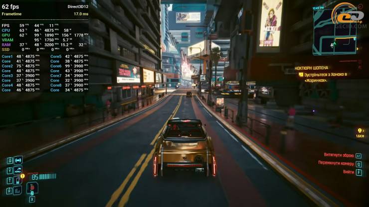 Якщо ж з’явиться бажання пройти Cyberpunk 2077 все ж таки з хоча б невеликим втручанням технології трасування променів, то її можна активувати на мінімальному рівні - тобто обрати RT Low. Але для піддослідної відеокарти навіть такий пресет є важкуватим, тому все ж таки доведеться використати режим апскейлінгу в якісному режимі, що не сильно погіршить чіткість картинки, але все ж таки іноді призводитиме до появи артефактів. Після таких маніпуляцій виходить отримати саме потрібні 60 FPS, але, варто зауважити, що через знов таки нестачу відеопам’яті подеколи зустрічаються доволі відчутні та неприємні посмикування, а широка шина не встигає рятувати.