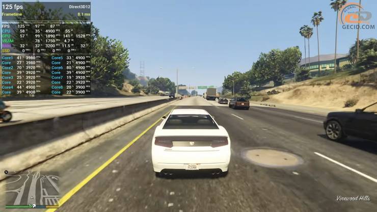 Оновлена версія Grand Theft Auto V з покращеною якістю ефектів та більш деталізованим рівнем трасуванням променів грається абсолютно комфортно на RT High пресеті графіки, при цьому надаючи більш ніж достатні показники FPS. Картинка оновлюється приблизно 120 разів за секунду. Тож здавалось би — а чому б не обрати вищі налаштування? Але, гра, на жаль, не дає змоги навантажити відеокарту на максимум та відмовляється переходити на більш важкий пресет графіки через брак потенційно потрібного об’єму відеобуферу.