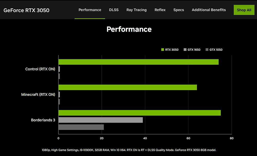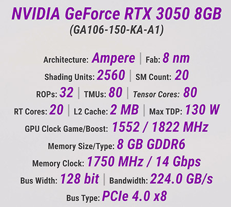 Все тому, що графічний процесор RTX 3050 містить 2560 CUDA-ядер, по 80 тензорних ядер та текстурних модулів, 32 блоки растеризації та лише 20 RT-ядер, чого може стати обмаль при важких налаштуваннях трасування променів. Також великим мінусом стає маленький L2 кеш об’ємом лише у 2 МБ. Базові частоти роботи прискорювача становлять 1552 МГц та 1822 у бустовому режимі. Щодо VRAM, то тут передбачено 8 ГБ GDDR6, які утворюють 224 ГБ/c пропускної здатності, через 128-бітну шину. А як перевагу можна зазначити доволі скромний рівень TDP лише у 130 Вт.