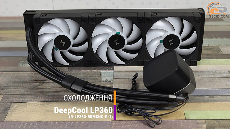 За охолодження CPU відповідала 360-мілімітрова система рідинного охолодження DeepCool LP360. В її основі — високоефективна помпа з робочою швидкістю до 3400 об/хв, що забезпечує стабільний відвід тепла. А за прискорення теплообміну відповідають три 120-мм вентилятори на гідравлічних підшипниках, які працюють зі швидкістю до 2400 об/хв та створюють потужний повітряний потік.