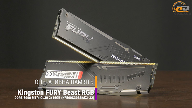 Як ОЗП використовувався яскравий комплект DDR5-6000 з двох 16-гігабайтних модулів Kingston FURY Beast DDR5 RGB, які ми розігнали до 6400 МТ/с з таймінгами 32-39-39 після збільшення напруги живлення до 1,4 В.