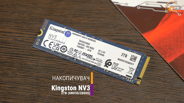 Для операційної системи та ігор ми обрали достатньо швидкий і відносно недорогий SSD-диск Kingston NV3 ємністю 2 ТБ. Цей небуферизований накопичувач дозволяє зчитувати дані на швидкості до 6000 МБ/с, а записувати – до 5000.