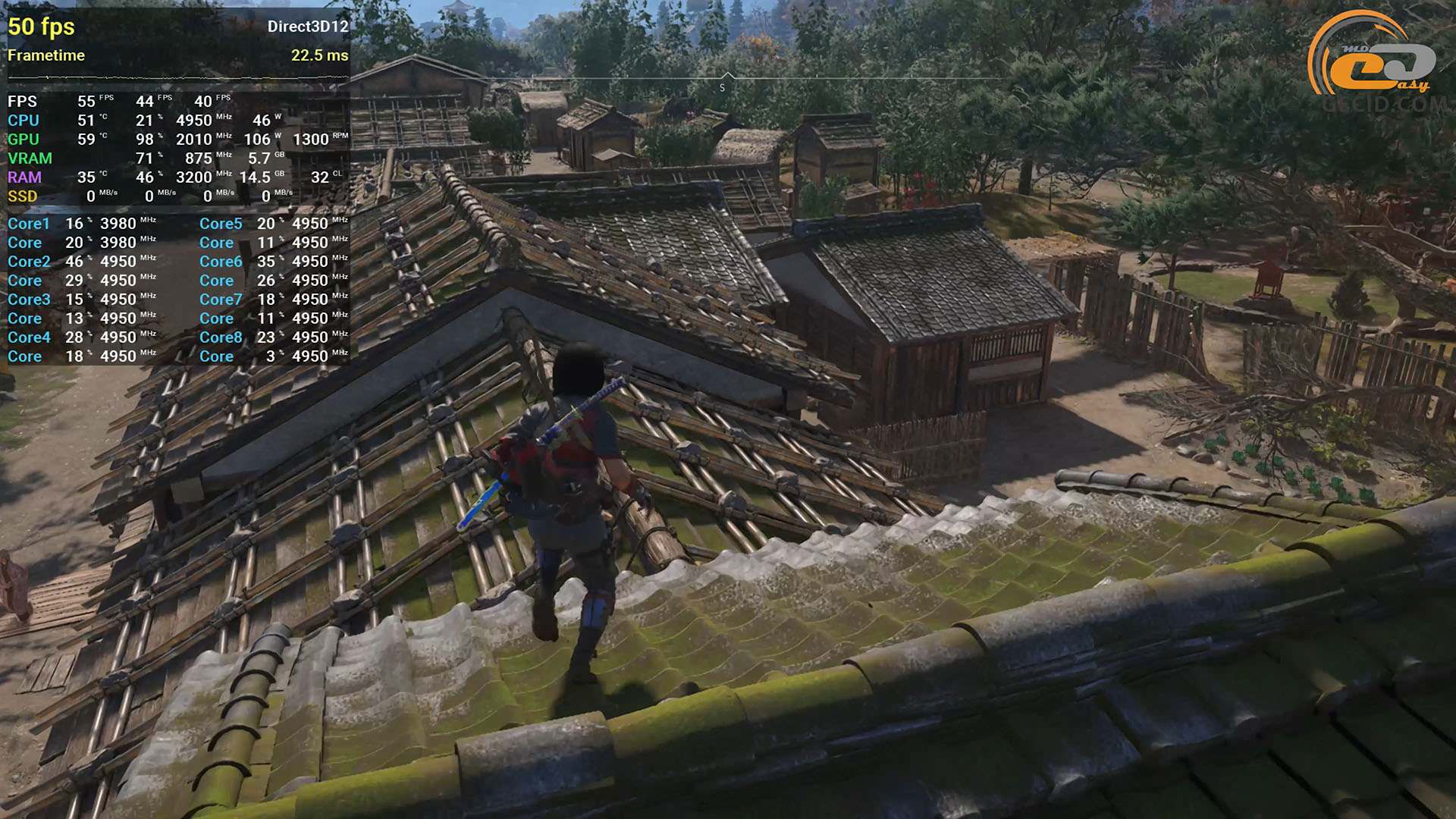 У більш важкому по навантаженню проекті — Assasin’s Creed Shadow «ультра» картинка вже залишається гарною мрією, бо навіть на середніх налаштуваннях отримати прийнятний ігролад виходить лише після активації якісного режиму DLSS. Проте навіть так частота оновлення екрану залишається досить мінливою — тож у простих сценах маємо коло 70 FPS, а під час долання важкої локації ці значення можуть падати до планки у 45-50 оновлень екрану за секунду.