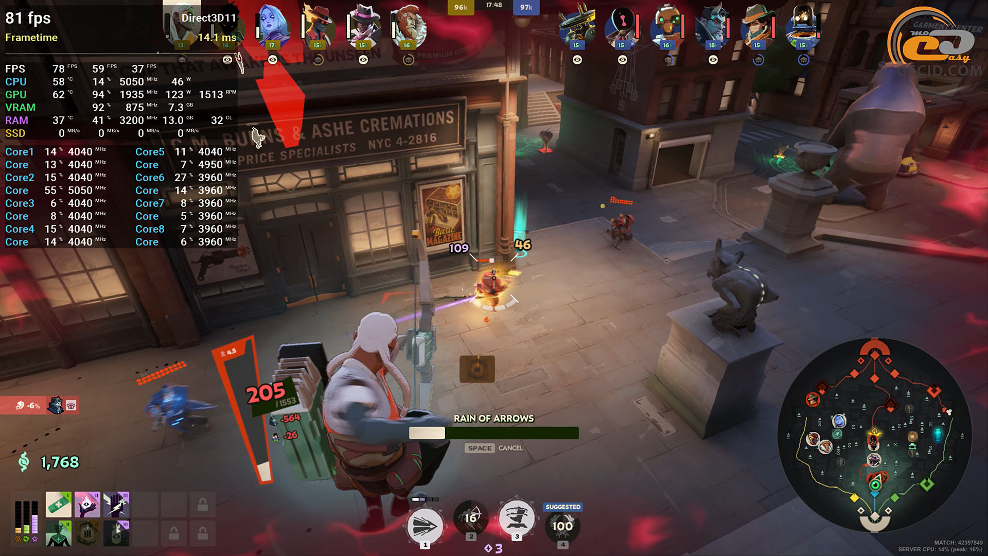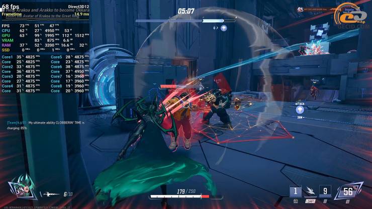 Вийти на битву проти інших супергероїв в Marvel Rival виходить на високих налаштуваннях картинки, а застосування апскейлеру в ультра якісному режимі дозволить отримати кращий рівень FPS у поєднанні з приємною на око картинкою. Таким чином ми отримуємо в середньму 60 кадрів за секунду, але треба враховувати, що іноді зустрічатимуться короткі посмикування та просідання FPS під час активних сутичок. Тому, можливо, у цій грі, через її активність, все ж таки доведеться віддавати пріоритет продуктивності аніж гарній картинці, та знижувати налаштування якості картинки.