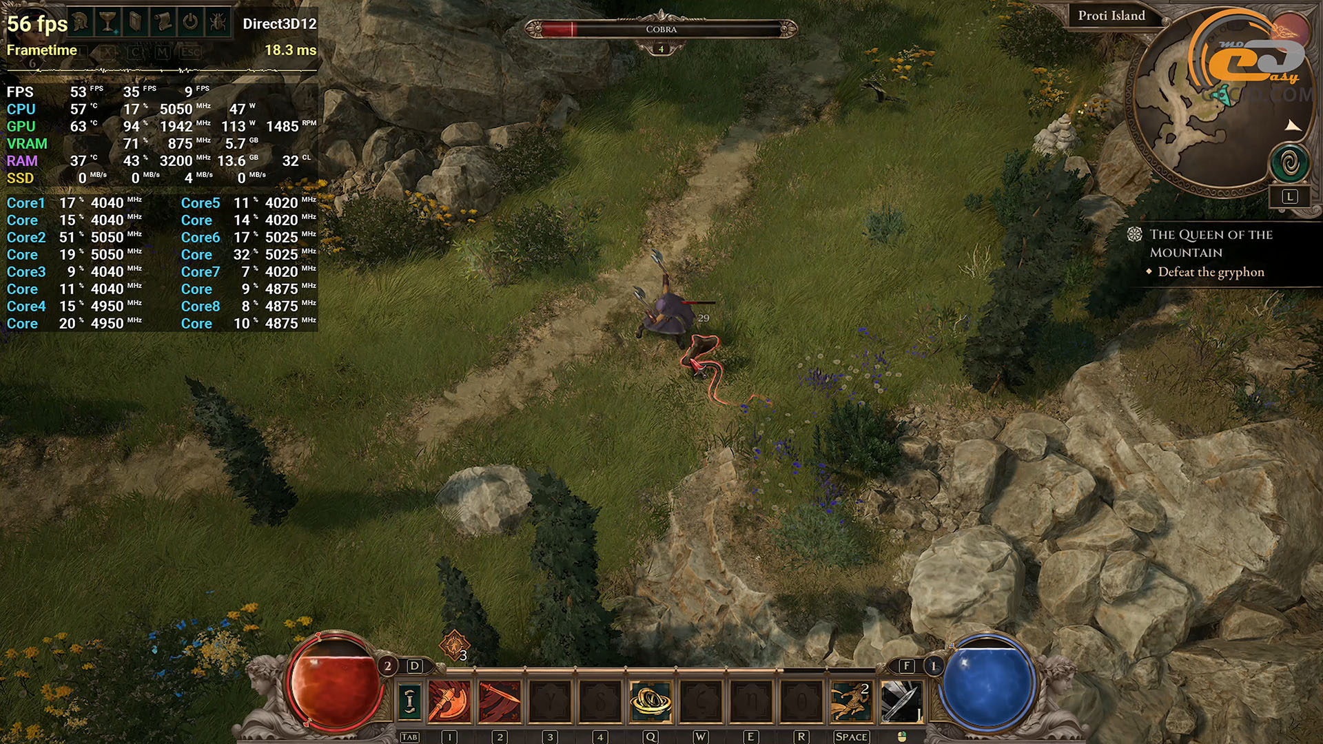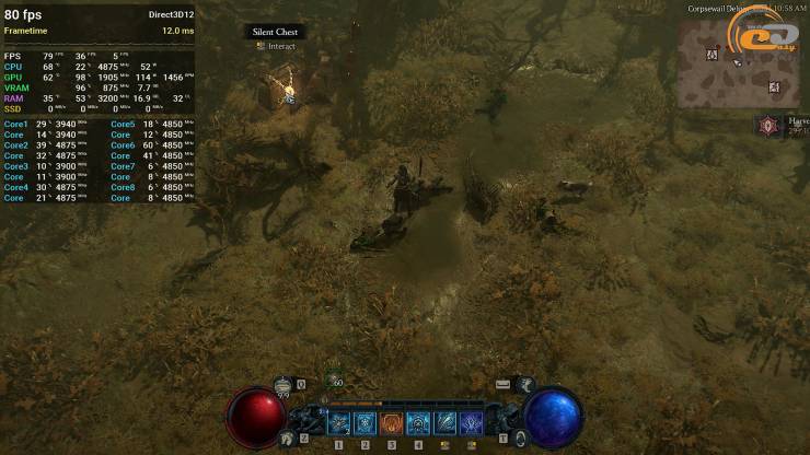 Несподівано у Diablo IV відеокарті виявився підсильним і максимально доступний пресет графіки без трасування променів. Плюс, незважаючи на майже повністю забитий відеобуфер, виходить активувати DLSS в режимі додаткового згладжування. На ділі маємо від 70 до 80 середніх кадрів за секунду, але тут є досить неприємний нюанс, про який свідчить статистика дуже рідкісних подій — доволі рандомні посмикування, які згодом можуть трохи вплинути на загальні враження від гри.