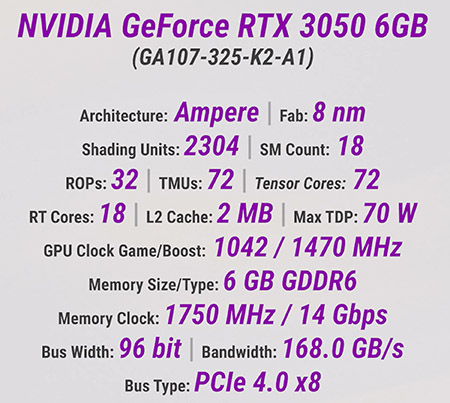 Також згадаємо, що пізніше компанія NVIDIA випустила варіант RTX 3050 з ще меншим об’ємом відеопам’яті - лише 6 ГБ з дуже вузькою 96-бітною шиною. Вона отримала нижчі робочі частоти у лише 1042 МГц та 1470 у стані буста. У графічний чип було закладено 2304 CUDA-ядра, 72 тензорних ядра і стільки ж текстурних модулів. Навіть кількість RT ядер скоротили до 18 одиниць. Ідентичною до потужнішої версії виявилась тільки кількість «ропів». Проте через зовсім скромні характеристики рівень TDP впав до показника в лише 70 Вт.