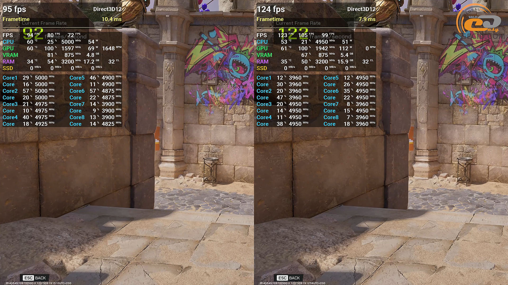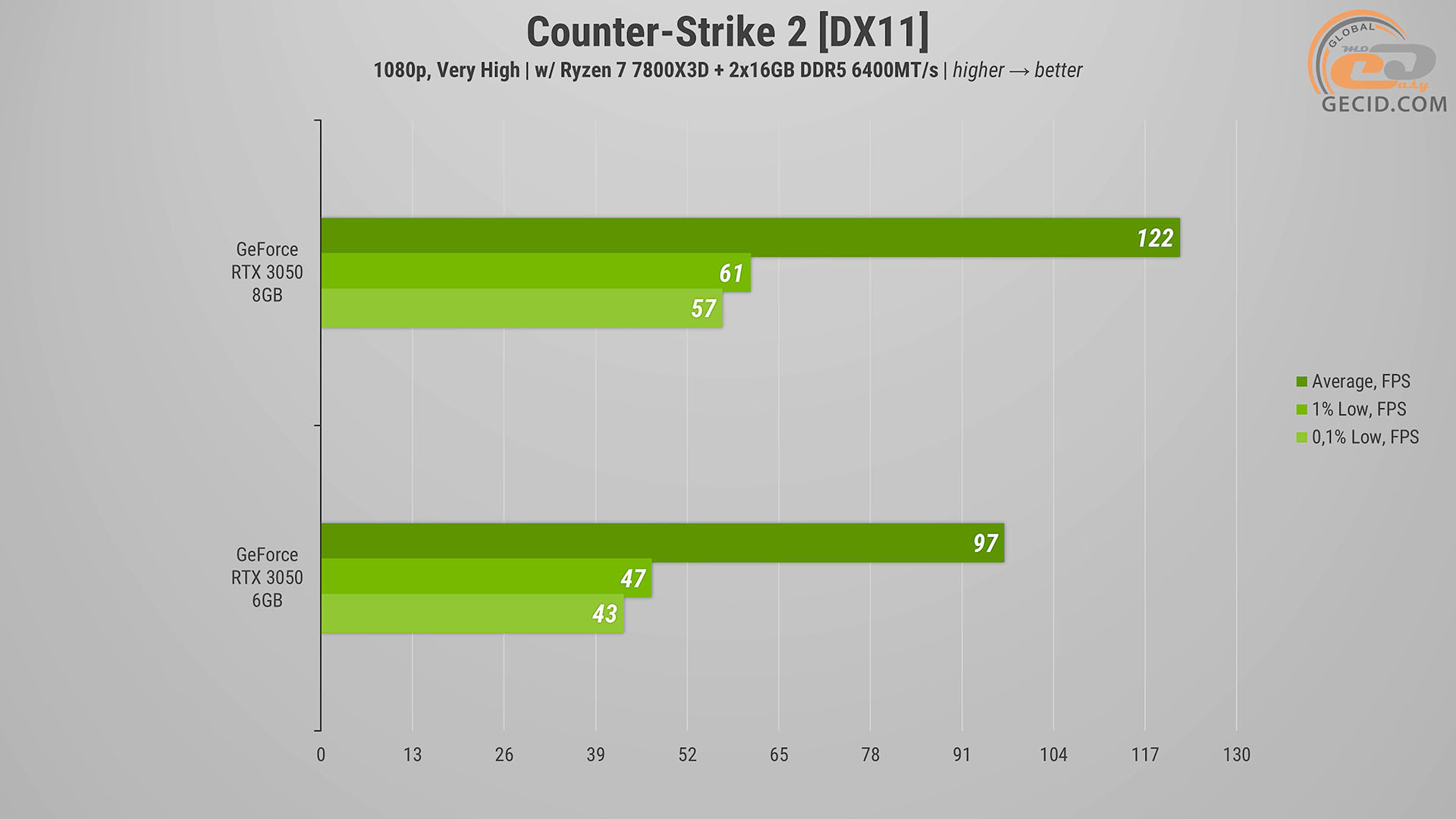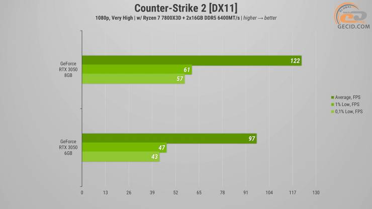 Подолати бенчмарк у Counter Strike 2 з достатнім для гри FPS при дуже високих налаштуваннях вдалося обом версіям відеокарти, проте потужніша версія виявилась сильнішою на приблизно 25 відсотків та у моменти різкого розвіювання димової гранати через вибух осколкової слабкіша відеокарта стикалася з відчутним просіданням FPS та короткими посмикуваннями.