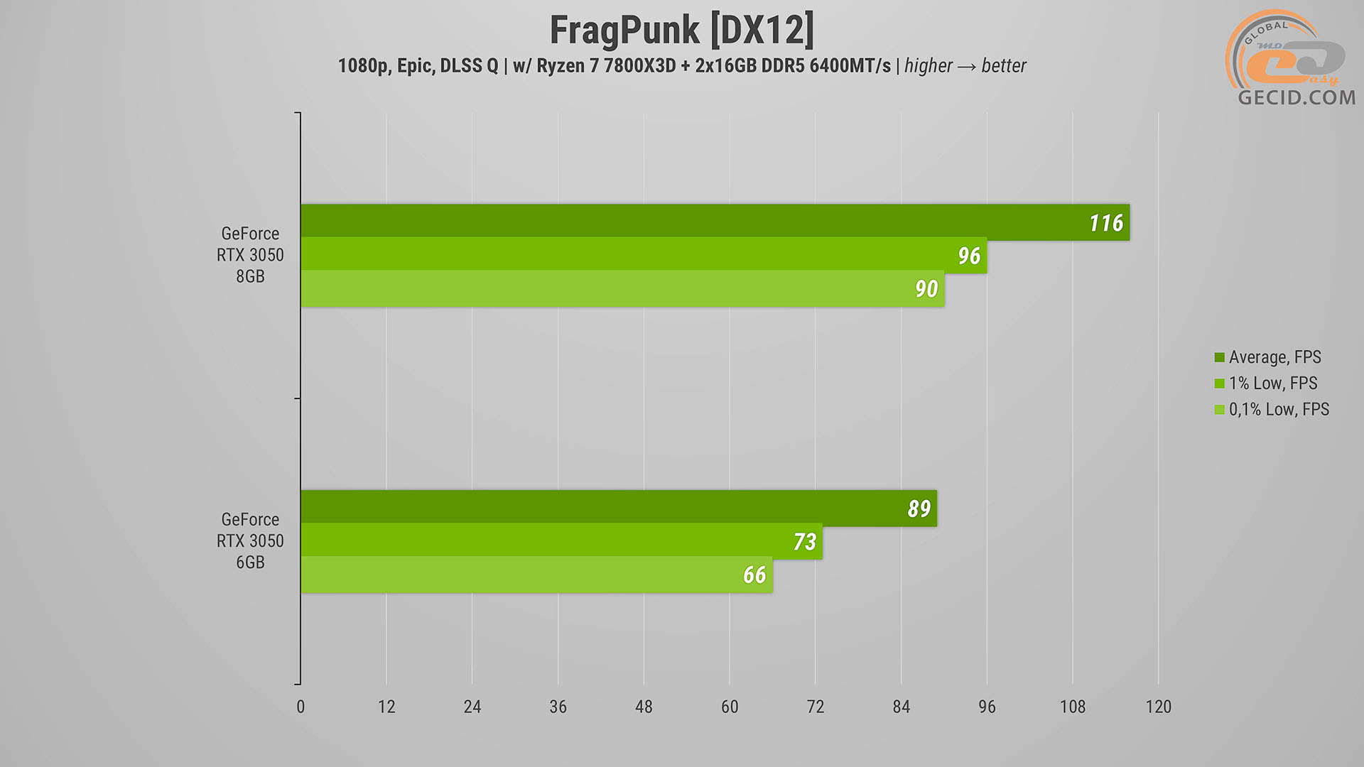 Активний шутер від першої особи FragPunk не виявився перешкодою для обох піддослідних прискорювачів — на епічних налаштуваннях разом з якісним рівнем масштабування маємо абсолютно достатній запас FPS. Можливо обидві відеокарти впоралися б і без втручання DLSS, але це могло б призвести до нестачі частоти оновлення під час активних перестрілок.
