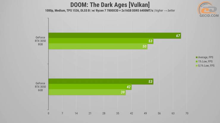 На середніх налаштуваннях разом із збалансованим режимом DLSS у DOOM: The Dark Ages на 8-гігабайтній версії вдалося отримати більше ніж 65 середніх кадрів за секунду. А от слабкіша версія у свою чергу показала не дуже приємний результат по FPS, хоч ігролад ще і залишався умовно прийнятним.