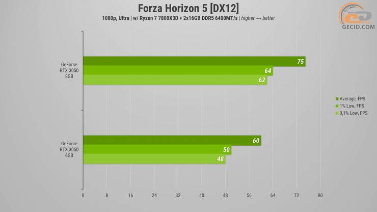 Під час перегонів у Forza Horizon 5 на ультрах потужніша версія знов виявилась на понад 25 відсотків сильнішою з результатом у 75 середніх кадрів за секунду, а 6-гігабайтна версія дозволила екрану оновлюватися рівно 60 разів за секунду разом з попередженнями про можливу нестачу відеобуферу.