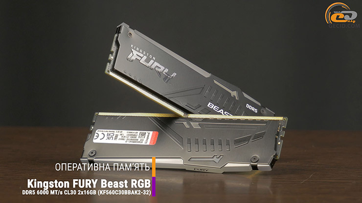 Як ОЗП використовувався яскравий комплект DDR5-6000 з двох 16-гігабайтних модулів Kingston FURY Beast DDR5 RGB, які ми розігнали до 6400 МТ/с з таймінгами 32-39-39 після збільшення напруги живлення до 1,4 В.