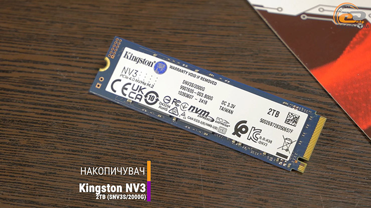 Для розміщення операційної системи та ігор ми обрали достатньо швидкий і відносно недорогий SSD-диск Kingston NV3 ємністю 2 ТБ. Цей небуферизований накопичувач дозволяє зчитувати дані на швидкості до 6000 МБ/с, а записувати – до 5000.