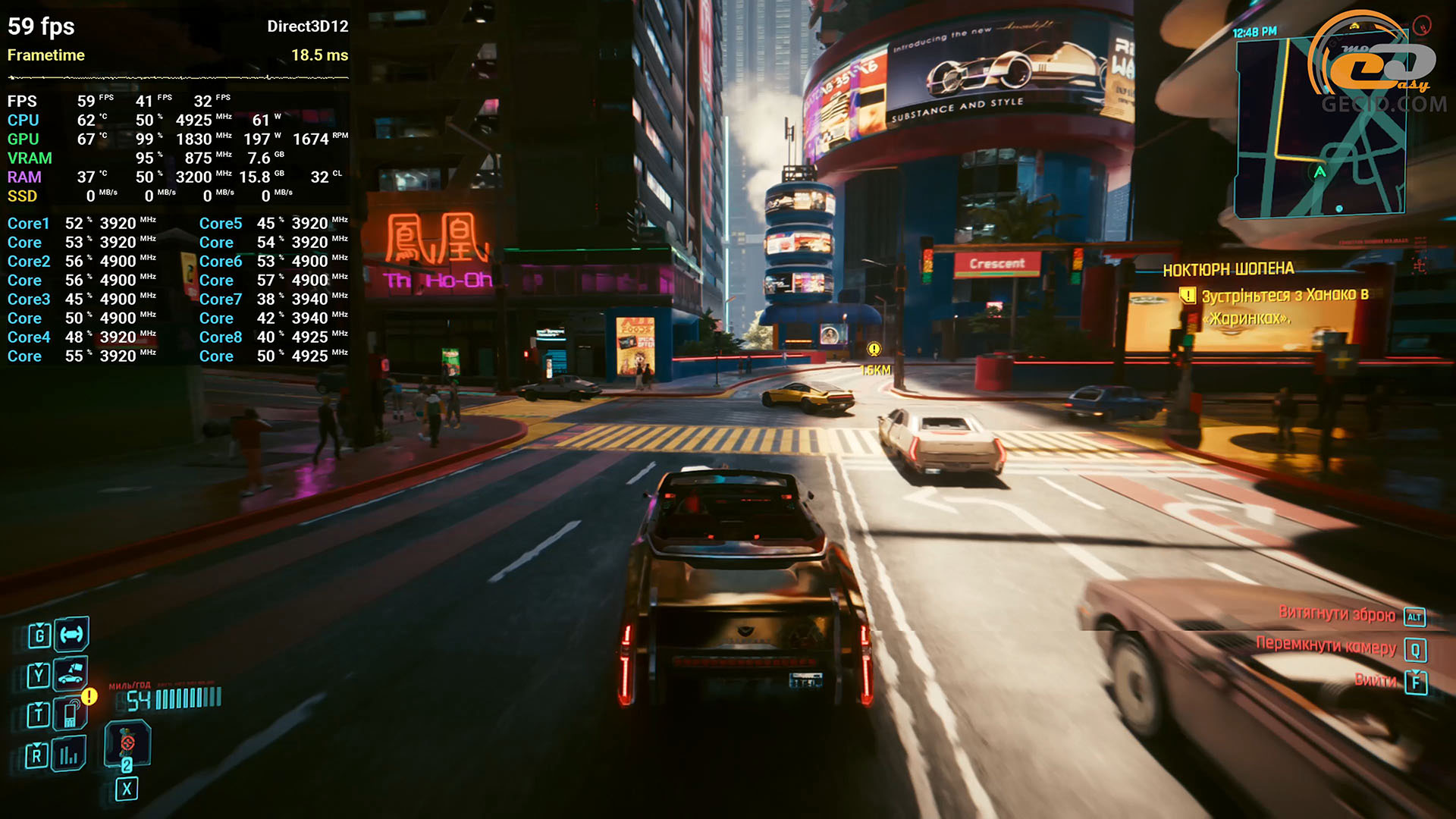 При бажанні пройти Cyberpunk 2077 з яскравою картинкою можна спробувати активувати майже максимальну якість трасування променів - RT Ultra. Проте доведеться використати режим апскейлінгу в якісному режимі, що не сильно погіршить чіткість картинки, але все ж таки створить подеякі розмитості та артефакти на неонових вивісках та білбордах. Після таких маніпуляцій середній FPS дозволить отримати доволі приємні відчуття від гри, але показник дуже рідкісних подій підтверджує наявність неприємних посмикувань, з якими подеколи прийдеться миритися.