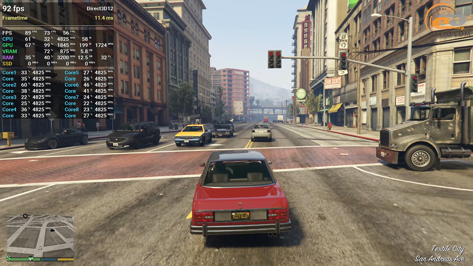 Також оновлена версія Grand Theft Auto V з покращеною якістю ефектів та більш деталізованим рівнем трасуванням променів для відеокарти не стає перешкодою навіть після застосування найважчого пресету графіки Maximum RT. У центрі міста картинка оновлюється приблизно 90 разів за секунду, а коли заїжджаємо в густу рослинність ігролад залишається приємним, хоч і втрачаємо десь чверть від минулого FPS.