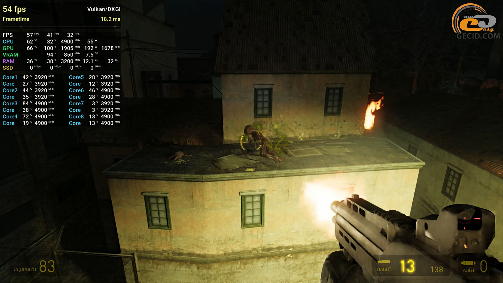 Заради цікавості ми вирішили запустити і графічно прокачану версію Half-Life 2 RTX. Тут відеокарті стало явно важко долати таке випробування як через нестачу відеопам’яті, так і недостатній запас продуктивності. З’ясувалося, що лише з низькими налаштуваннями графіки та збалансованим режимом DLSS вдається отримати близький до приємного режим гри.