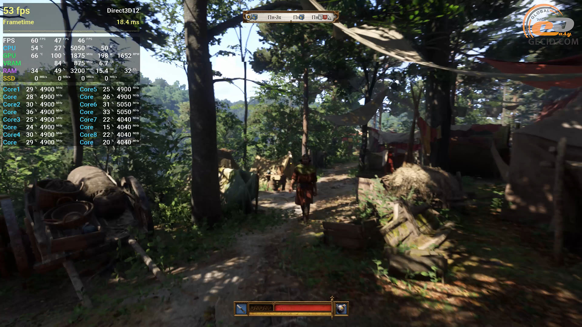 Прогулянку старовинним лісом у Kingdom Come Deliverance II можна назвати майже ідеальною на ультра пресеті графіки і однозначно мати тільки приємні враження від пропрацьованої природи навкруги. Так, коли заходимо до табору з великою кількістю NPC зустрічаються незначні просідання нижче 60 FPS, але у свою чергу вони зовсім не відчуваються критичними.