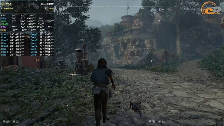 Разом із активацією якісного режиму DLSS з’являється можливість перейти вже на середні налаштування. При цьому кількість оновлень екрану за секунду не тільки не зміниться, а й ще і збільшиться та більш-менш наблизиться до стабільних 60-ти під час активних подій. Але, варто відмітити підфризи, які час від часу намагаються зіпсувати загальні враження від ігрового процесу — це можна перекласти на ще недостатню оптимізацію проекту або вже на недостачу об’єму відеобуферу.