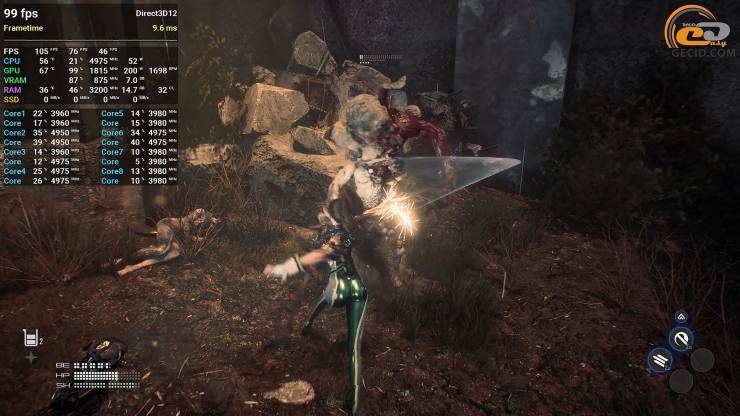 Продовжуємо також на гарній ноті, бо у слешері Stellar Blade на дуже високому пресеті графіки, незважаючи на попередження про недостачу ресурсів системи, не зустрічаємо проблем із продуктивністю, навіть після додання DLAA згладжування, бо лічильник частоти кадрів за секунду майже завжди стабільно показує значення вищі за 100, а посмикувань взагалі не зустрічається.