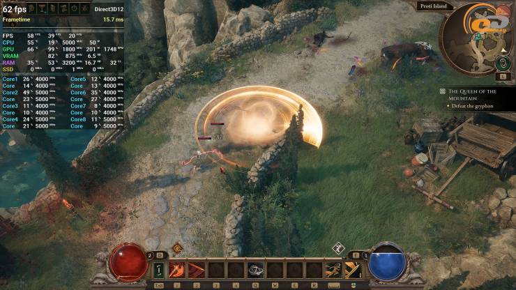 Якщо у Path of Exile 2 викрутити усі опції на максимум, то допомога апскейлеру усе одно не стає в нагоді. Тож маємо коло 60 стабільних оновлень екрану за секунду. Проте все ж таки у важких сутичках зустрічаються некритичні просідання FPS та короткі посмикування. Тому, можливо, потрібно замислитися про зниження вибіркових налаштувань для того, щоб не знати проблем навіть у ендгеймі.