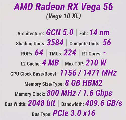 В основі Radeon RX Vega 56 лежить графічний процесор Vega 10 XL, побудований на мікроархітектурі GCN 5-го покоління. Він налічує 3584 потокові процесори, 224 текстурні блоки та 64 блоки растеризації. Базова частота GPU становить 1156 МГц, тоді як динамічний буст може досягати 1471 МГц, хоча на практиці ці значення суттєво залежать від температури та енергоспоживання.
