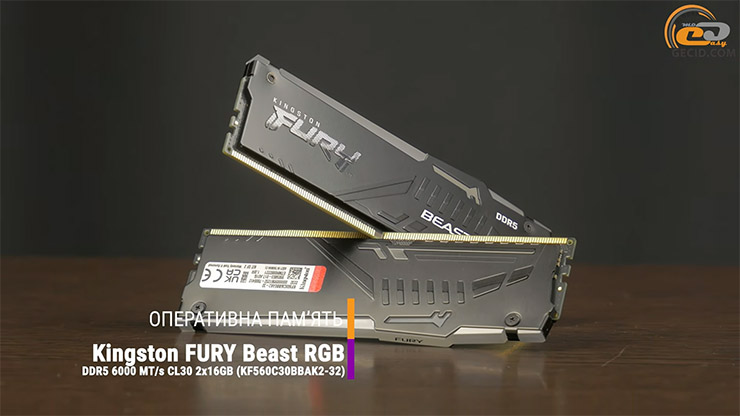 Як ОЗП використовувався яскравий комплект DDR5-6000 з двох 16-гігабайтних модулів Kingston FURY Beast DDR5 RGB, які ми розігнали до 6400 МТ/с з таймінгами 32-39-39 після збільшення напруги живлення до 1,4 В.