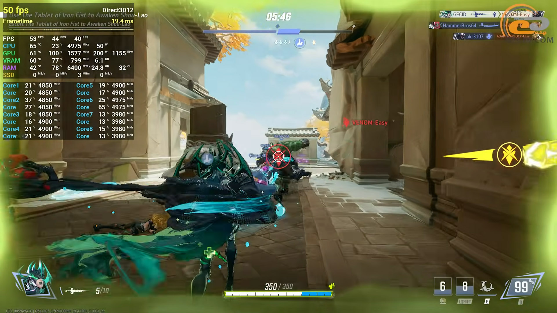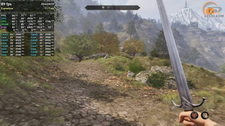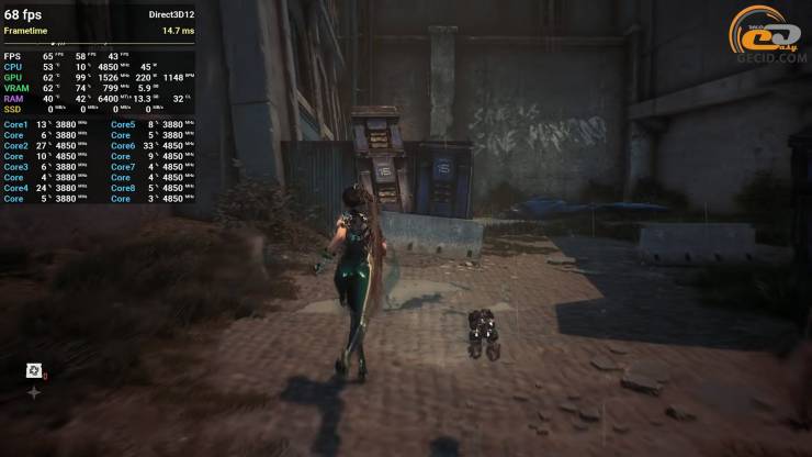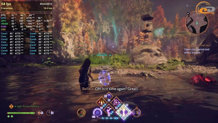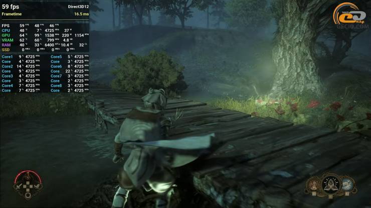 Знову завітали до закритого тестування гри Soulframe, яка навіть на середньому пресеті графіки, що стає максимально допустимим для піддослідного прискорювача, дивує приємною оптимізацією та деталізованою картинкою, якщо оцінювати візуальну складову ефектів та світ навкруги. Проте відеокарта все ж таки витягує майже стабільні 60 FPS з деякими некритичними просадками під час використання різноманітних заклять.