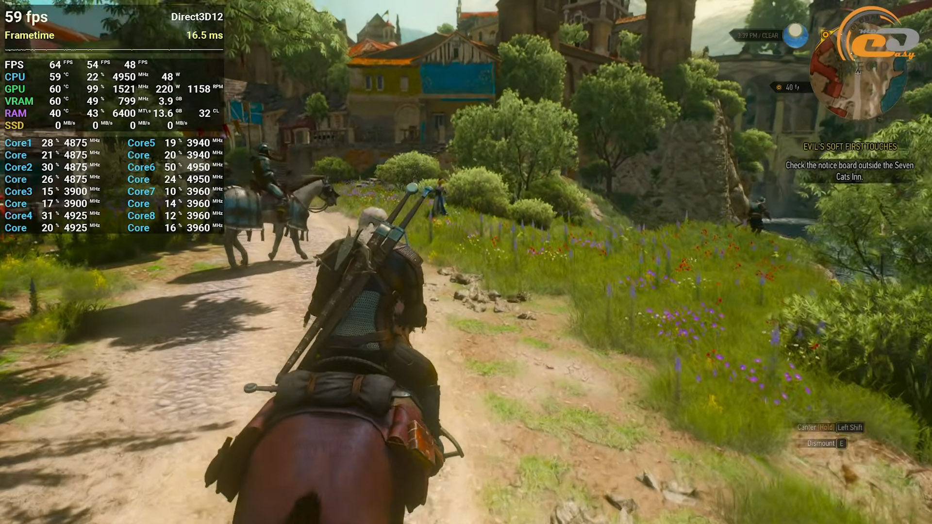 Завершуємо тестування у Відьмак 3: Дикий гін на ультра плюс графіці, зрозуміло без трасування променів. У такому режимі гра все ще тішить око щільною атмосферою, глибокими кольорами та високою деталізацією оточення, водночас не перевантажуючи відеокарту. Частота кадрів тримається на стабільному рівні, що дозволяє спокійно досліджувати світ, брати контракти й занурюватися в сюжет без технічних відволікань. Саме так гра сприймається найбільш приємно — ніщо не заважає мандрівці дорогами Велена… хіба що черговий знак питання на мапі, який ну ніяк не можна проігнорувати.