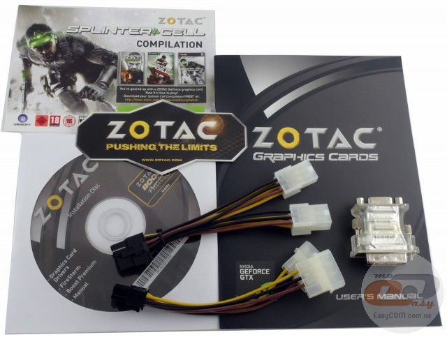 В упаковці, крім самої відеокарти, можна знайти диск з драйверами і утилітами, два перехідники живлення, посібник користувача, наклейку на корпус з логотипом компанії ZOTAC, перехідник з DVI на D-Sub і приємний бонус у вигляді купону на безкоштовне завантаження ігор серії Splinter Cell. Єдине, чого не вистачає, то це містка NVIDIA SLI. У випадку, якщо виникне потреба об'єднати кілька моделей для спільних розрахунків графічних ефектів, його доведеться купувати окремо.